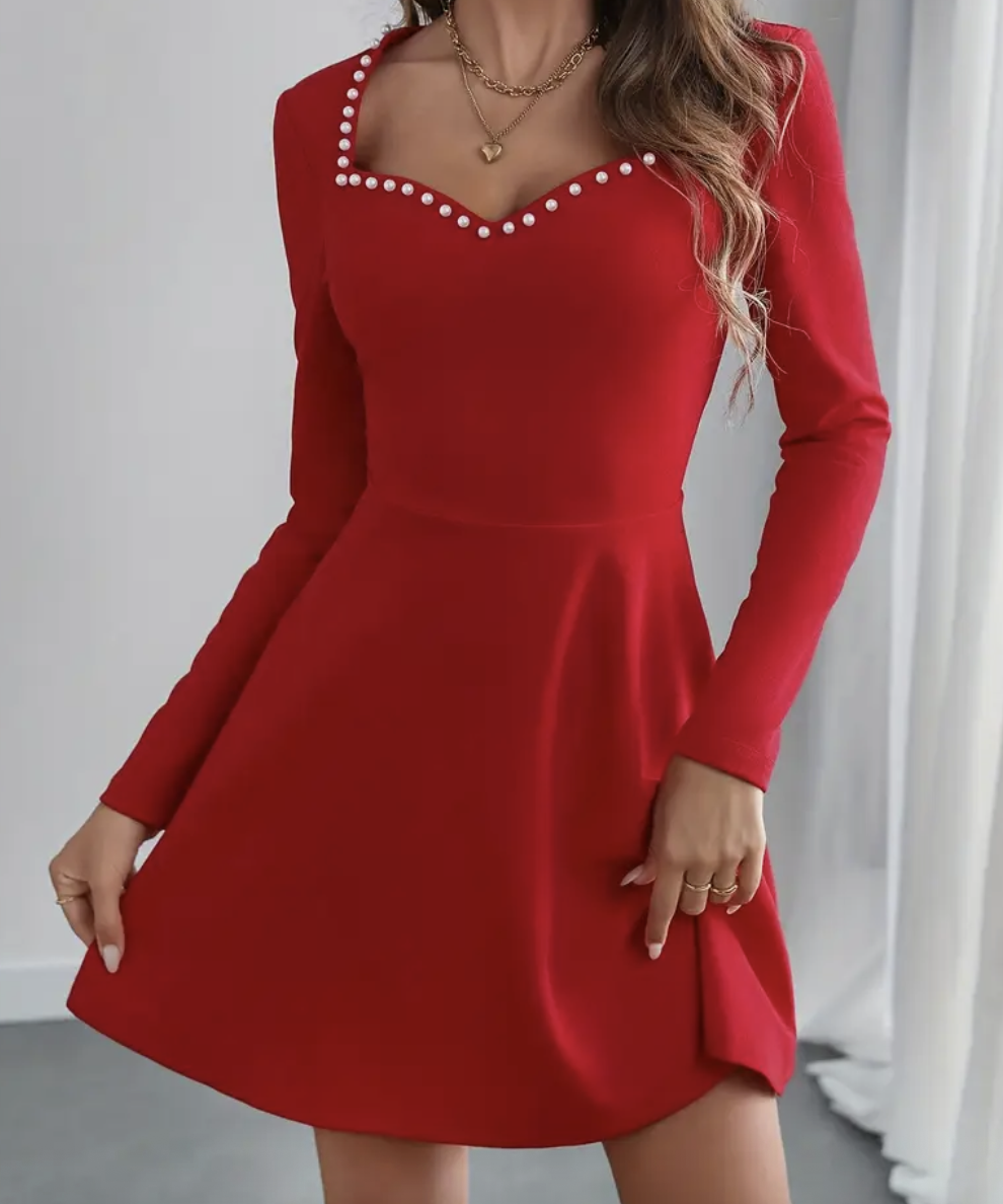 Elegant Pearl Detail Solid Color Long Sleeve Dress for Women, 95% Polyester 5% Elastane, Knit Fabric, Sweetheart Collar Dress