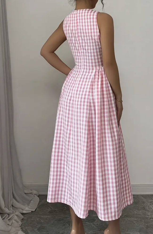 Gingham Check Mid-Length Dress -PINK