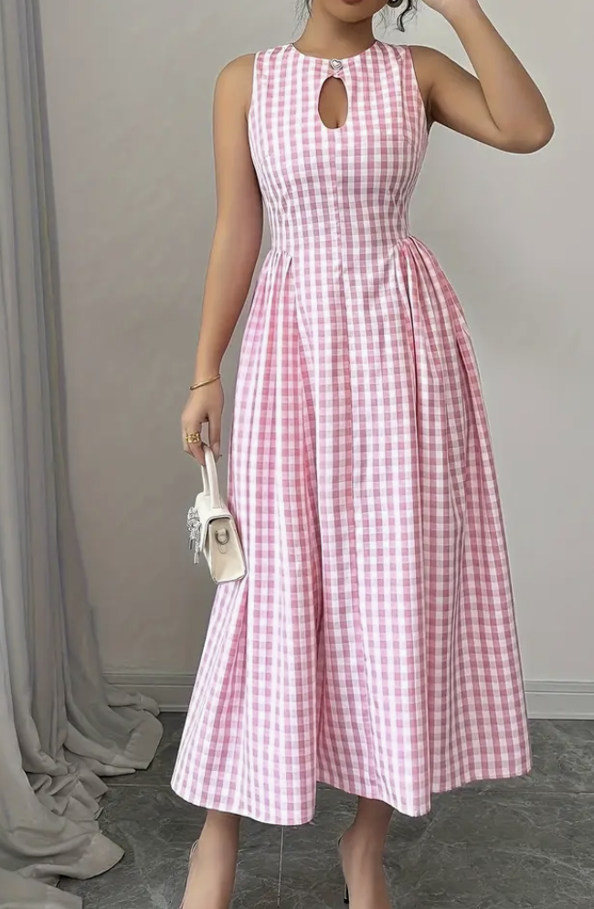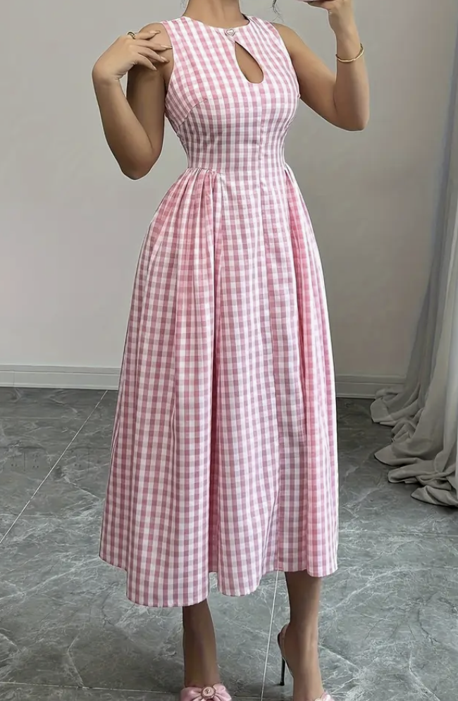 Women’s Gingham Check Mid-Length Dress with Heart Button Details – Sleeveless A-Line Vacation Dress for Spring/Summer