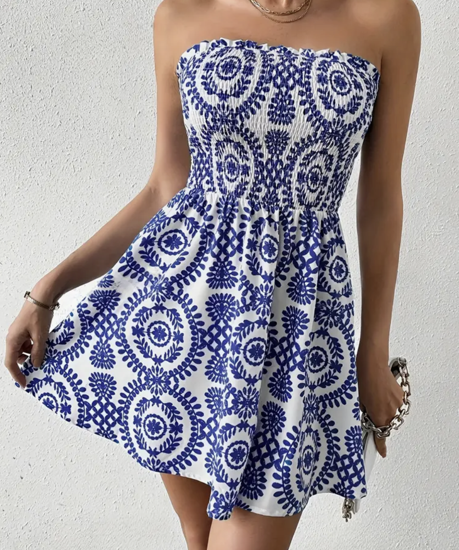 Women’s Navy Blue & White Paisley Print Smocked Off-Shoulder Dress