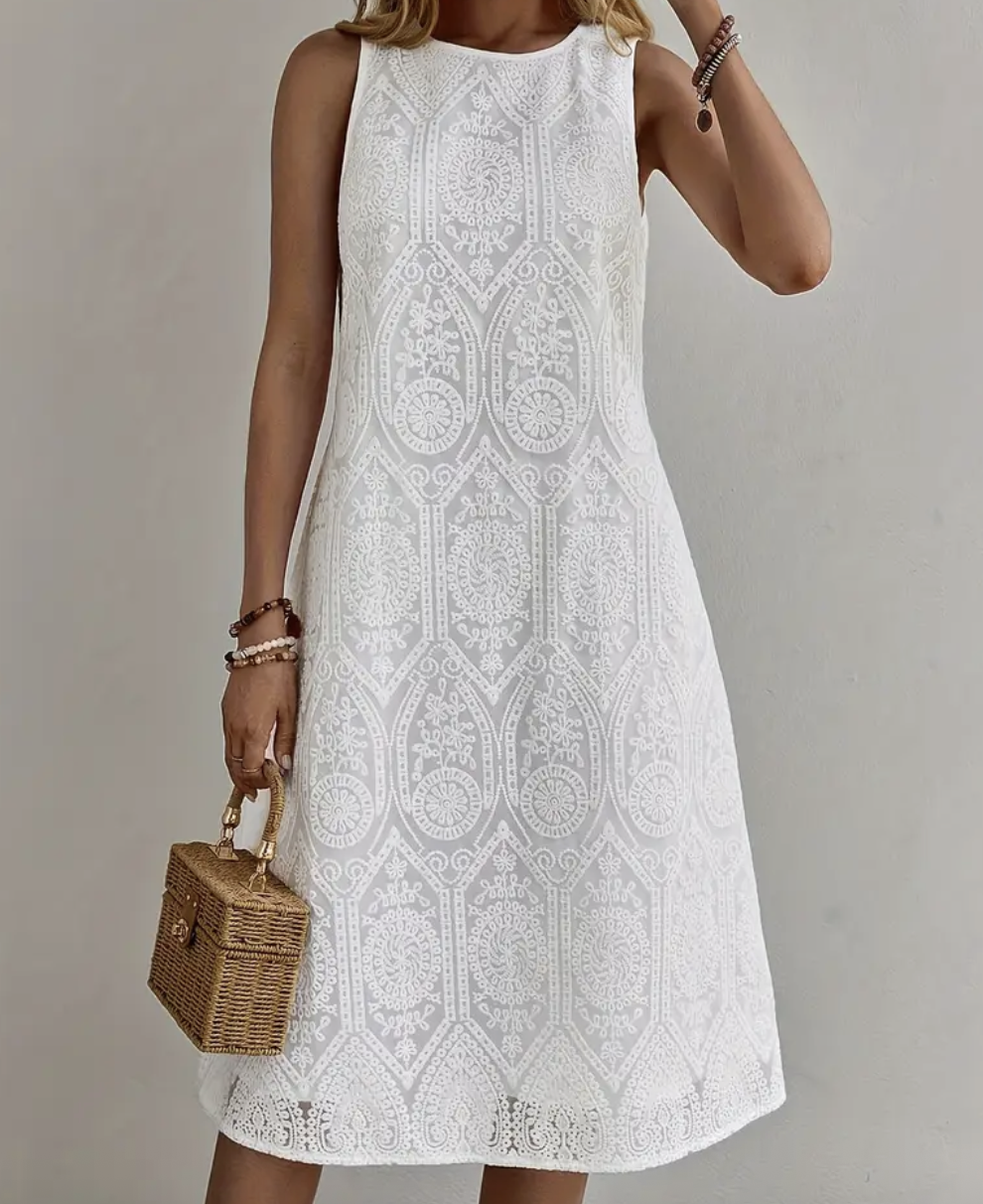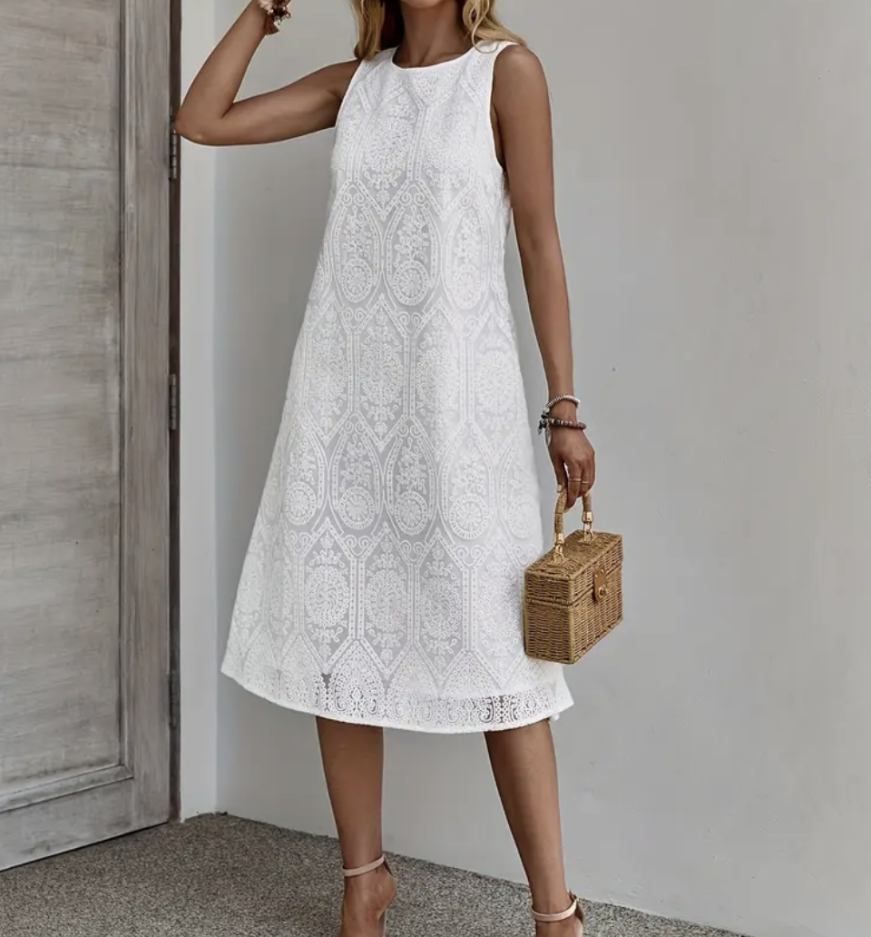 Women’s Sleeveless Round Neck White Midi Dress – Elegant Fitted Beach Dress