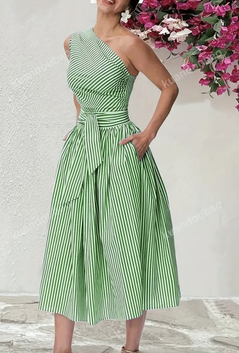 Casual Loose-Fitting Striped Sleeveless Dress with a Belt.