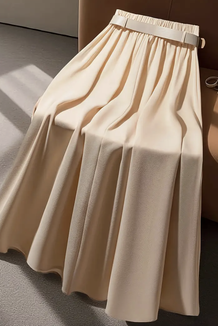 Summer Trendy Beige Belted Midi Skirt with a High Waist And Pleats